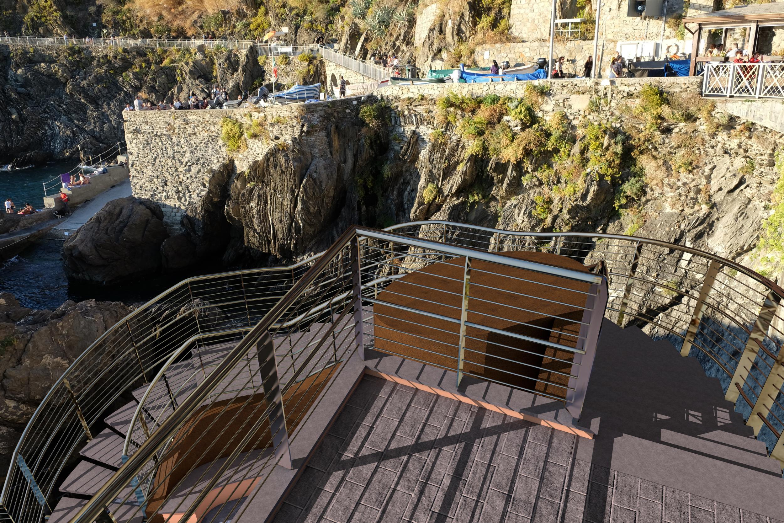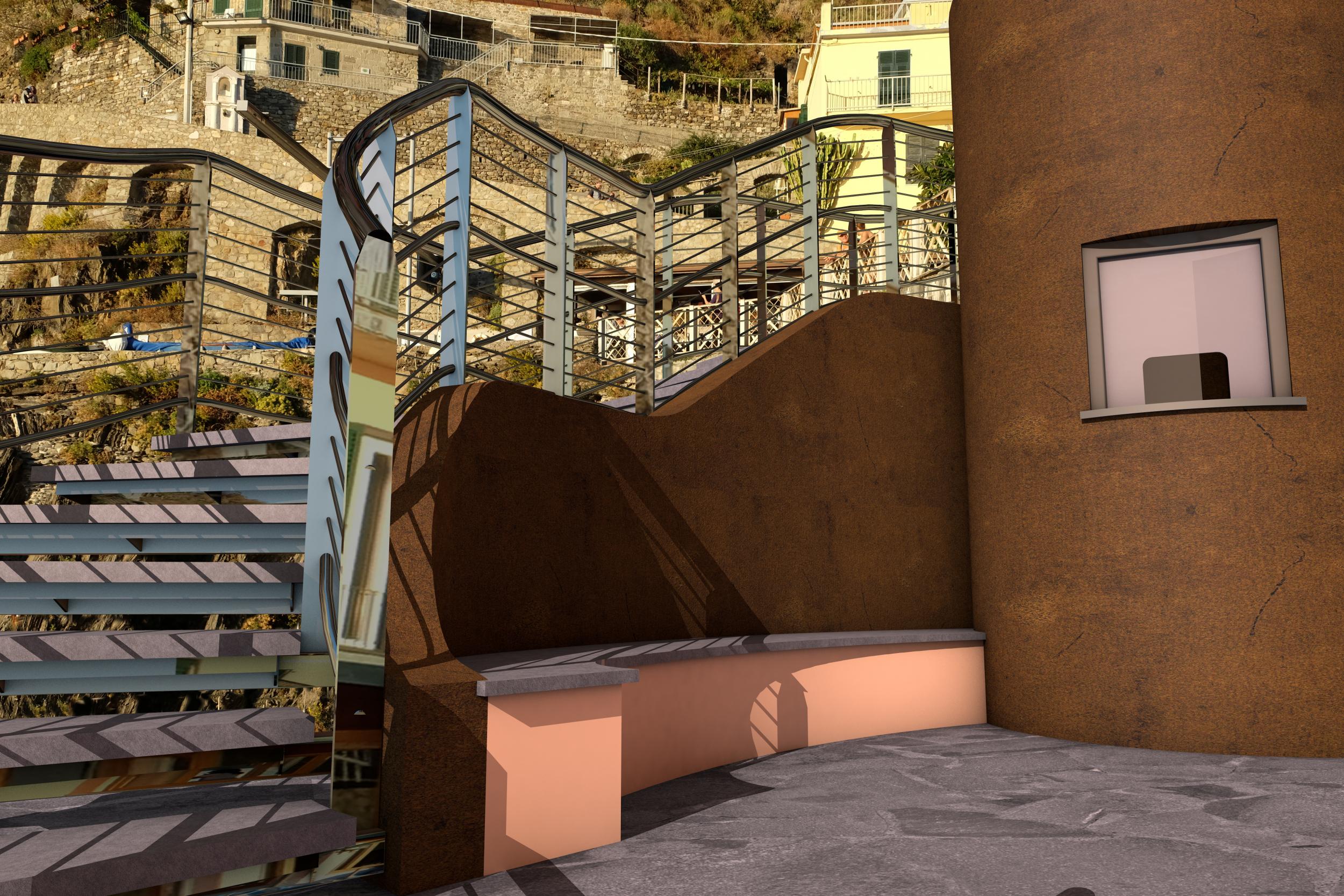 Studio per realizzazione scala di accesso all'imbarcadero della Marina di Manarola con locale biglietteria e servizi igienici.