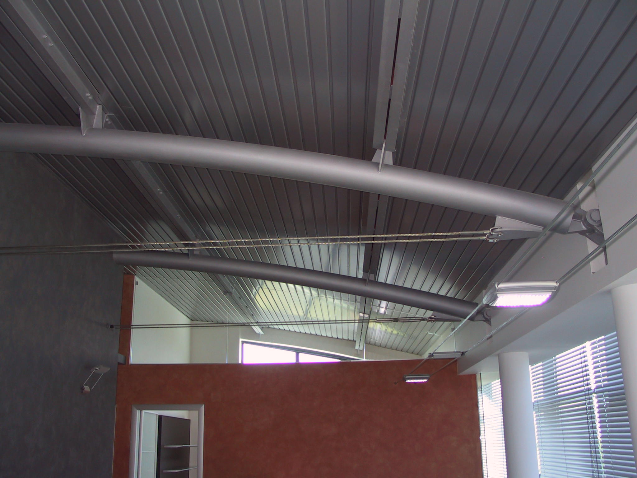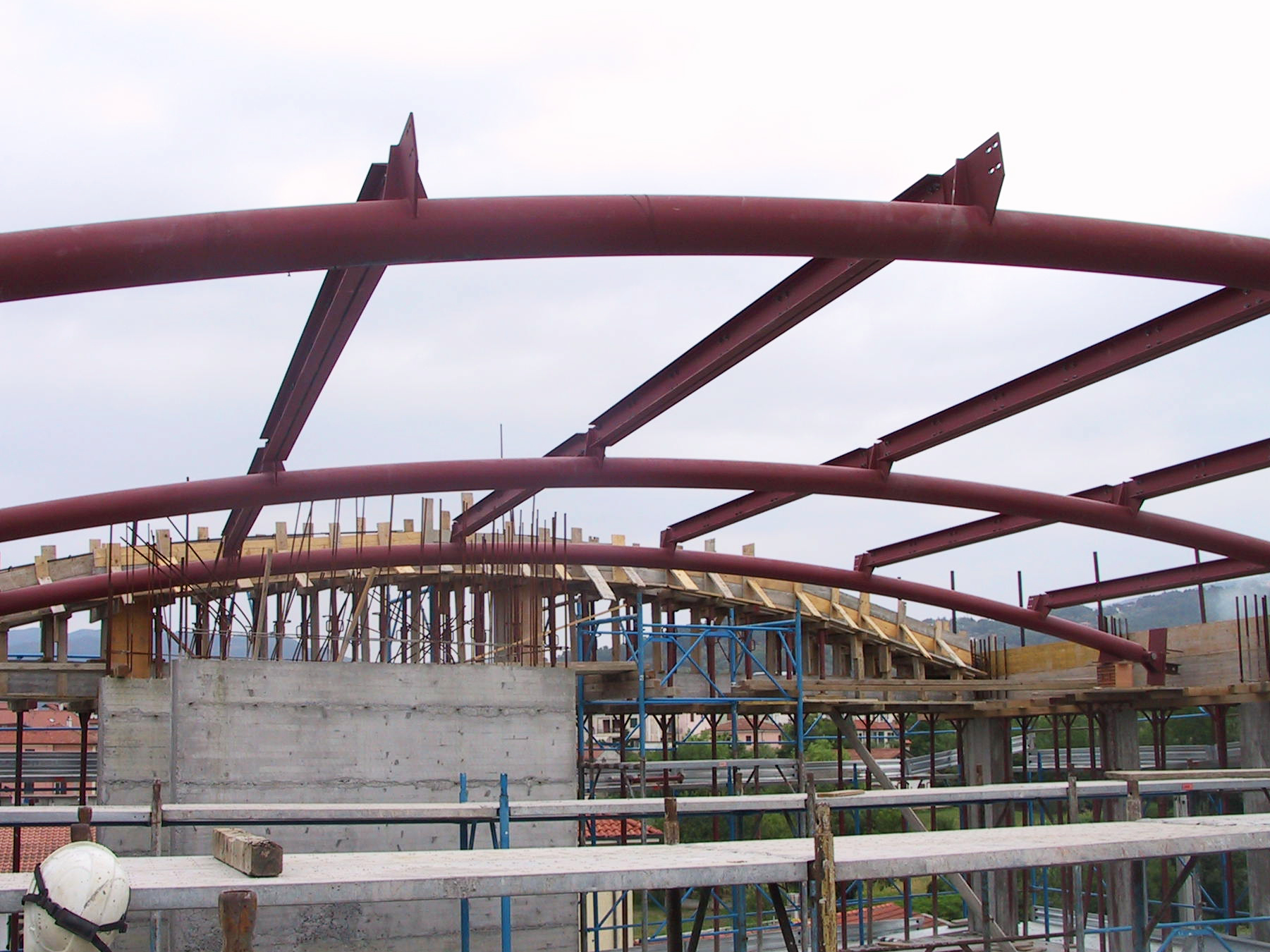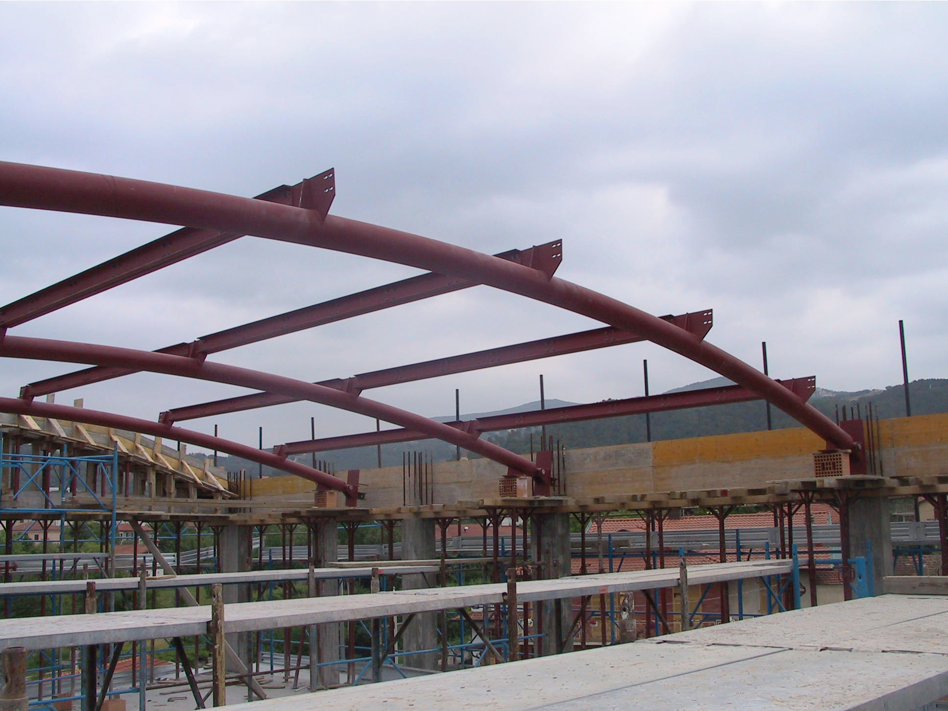 Copertura curva in acciaio con profili tubolari calandrati e cerniere in acciaio vincolate alla trave perimetrale in calcestruzzo armato.