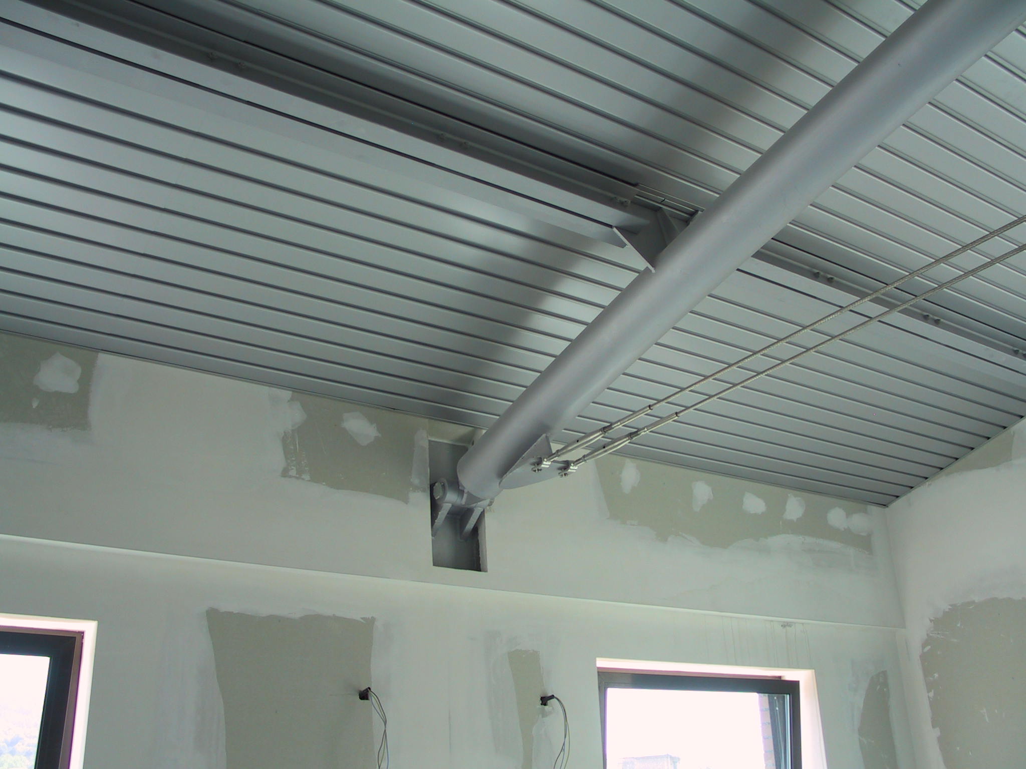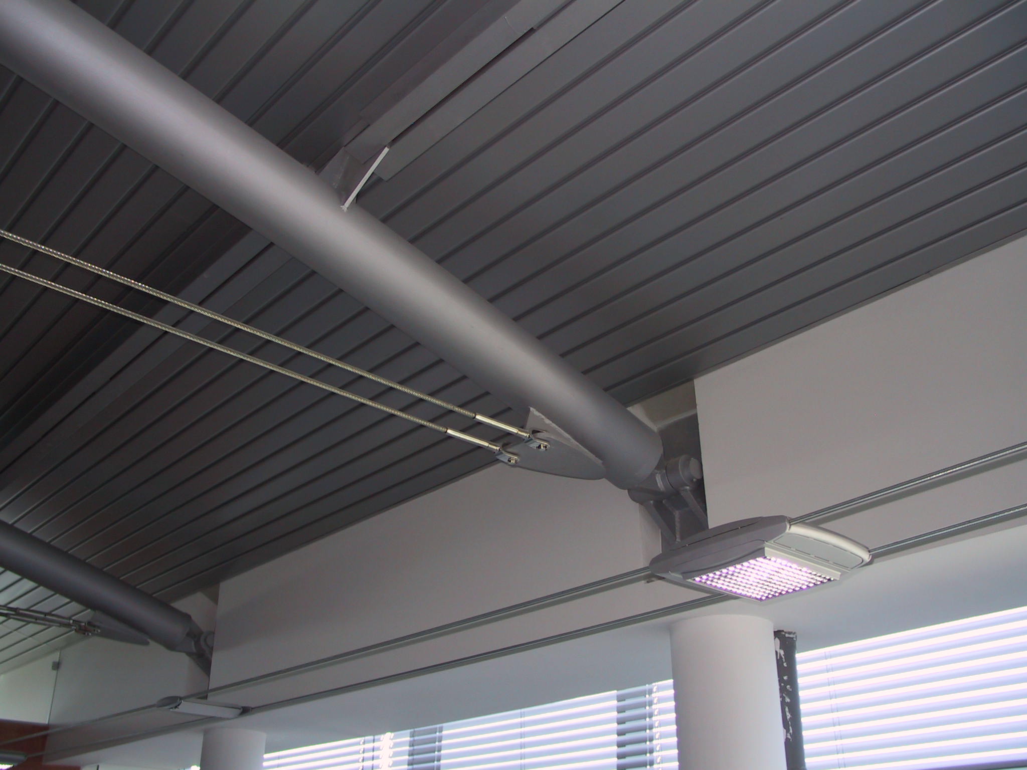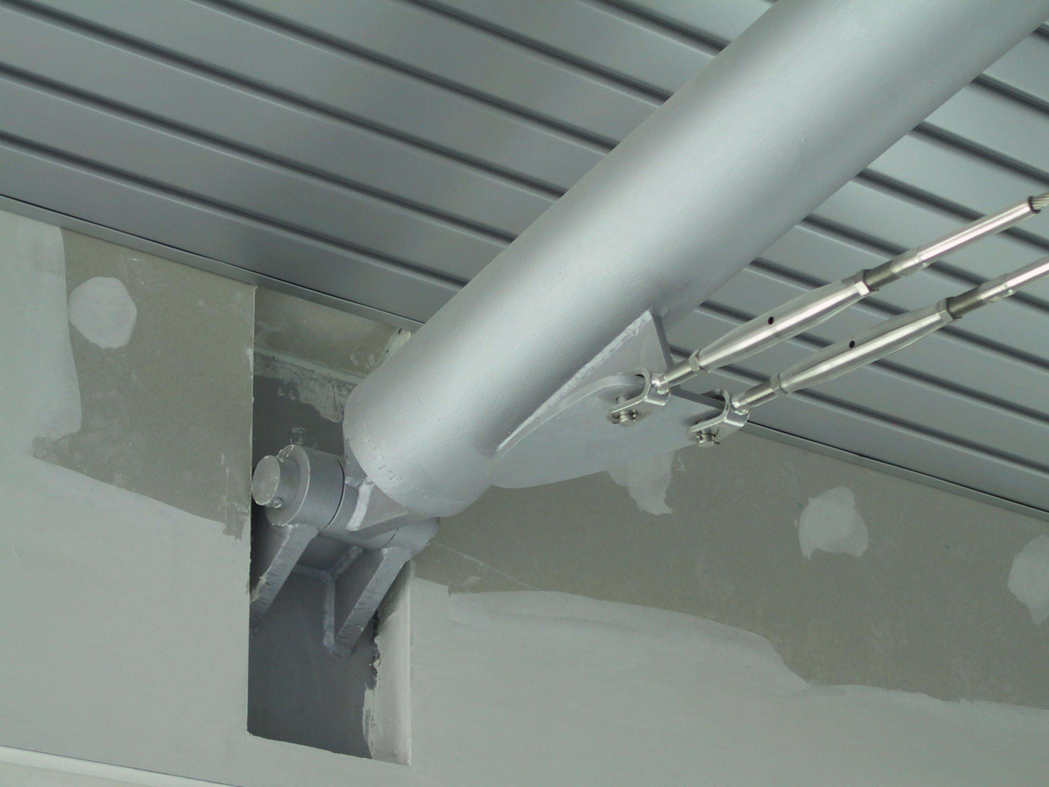 Copertura curva in acciaio con profili tubolari calandrati e cerniere in acciaio vincolate alla trave perimetrale in calcestruzzo armato.